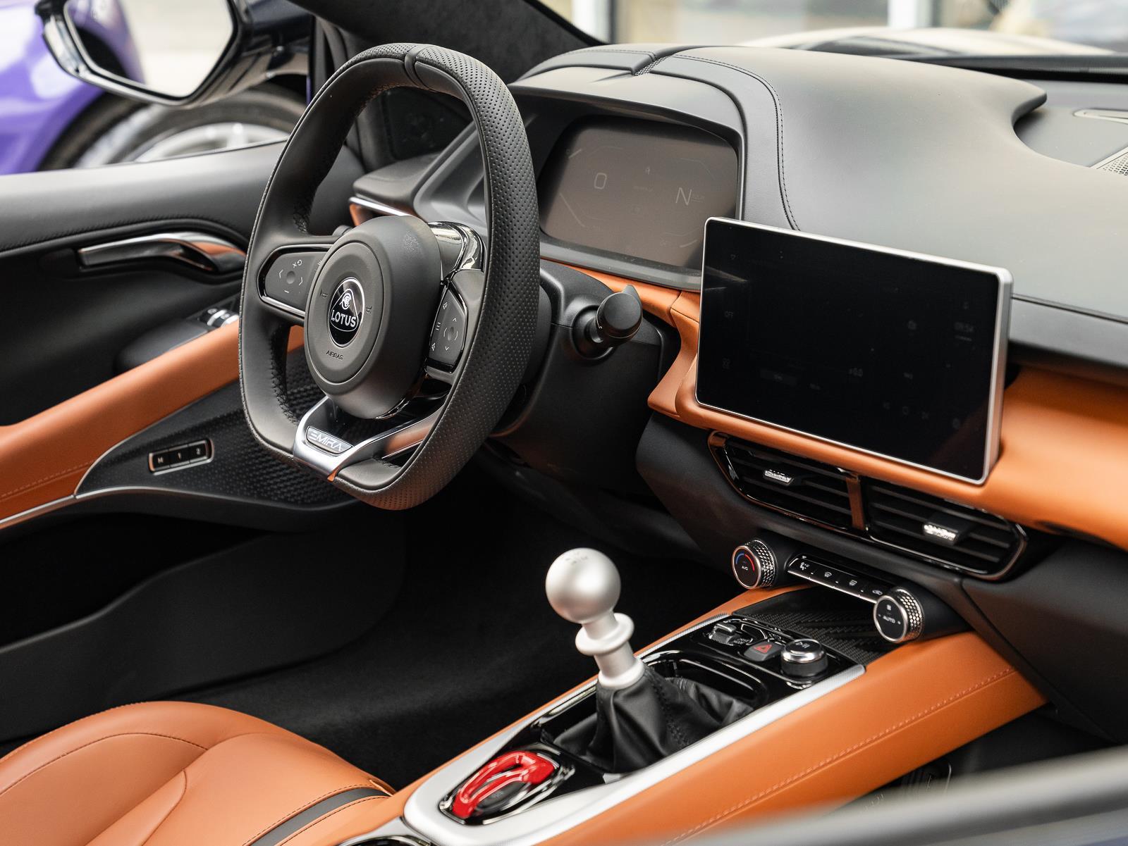 This brand new 2026 Lotus Emira SE V6 Manual finished in striking Meridian Blue over a Tan interior represents one of the purest modern driver focused sports cars available, combining mid engine balance with an increasingly rare analog manual transmission experience. Power comes from a 3.5 liter supercharged V6 producing 400 horsepower and 310 lb ft of torque, paired to a 6 speed manual transmission driving the rear wheels through a limited slip differential. Performance is highly engaging, with 0 to 60 mph achieved in 4.3 seconds and a top speed of 180 mph. The lightweight bonded aluminum chassis and mid engine architecture contribute to a curb weight near 3,500 lbs, delivering exceptional steering precision and dynamic balance that reflect Lotus engineering philosophy centered on driver feedback rather than raw numbers. Chassis dynamics are a defining highlight, featuring double wishbone suspension front and rear with coil springs and high pressure monotube dampers, available in Touring or Sport calibration depending on driver preference. Hydraulic power steering provides outstanding road feel that is increasingly rare in modern performance cars, while large AP Racing brakes deliver strong and consistent stopping performance under demanding driving conditions. The cabin blends motorsport inspiration with modern usability, offering a fully digital instrument cluster, central touchscreen infotainment with Apple CarPlay and Android Auto, premium KEF audio, supportive sport seats, dual zone climate control, and exposed manual shift linkage that enhances the mechanical connection between driver and machine. With its brand new condition, bold Purple Haze specification, and purist mechanical configuration, the Emira SE V6 stands as a modern interpretation of classic Lotus values, prioritizing balance, engagement, and emotional driving experience while remaining comfortable enough for everyday usability. Options - Meridian Blue - Touring Suspension - Lower black pack - Yellow Brake Calipers - 20"" Forged Ultra Lightweight Gloss silver Prism Wheels - Tan Leather Interior materials - Black leather Steering Wheel - Alcantara Headliner - Black seat belt - Yellow and Black nose badge and center caps - KEF Premium Audio - Goodyear Eagle F1 Supersport - Sport Pedals